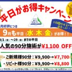 こんにちは。 8月限定で行っていた企画「夏休みキャンペーン 平日90分施術がお得!」キャンペーンを9月も延長させていただくこととなりました。 8月に何日か弊社都合の臨時休業をとらせて頂いたため、せっかく好評だったのに申し […]